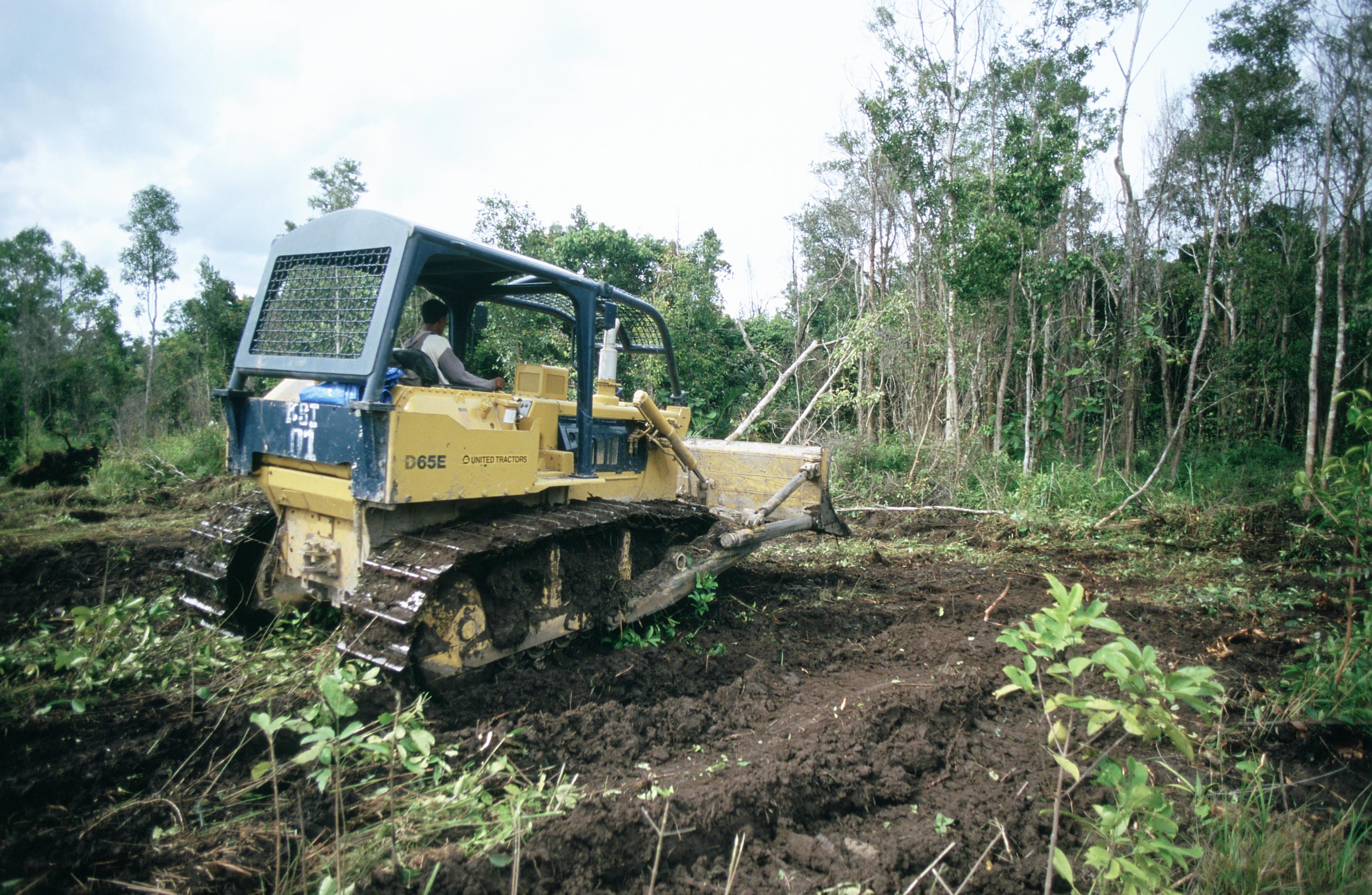 Bulldozer met rupsbanden vernietigt regewoud voor palmolieplantage, Kalimantan. Foto Aulia Erlangga